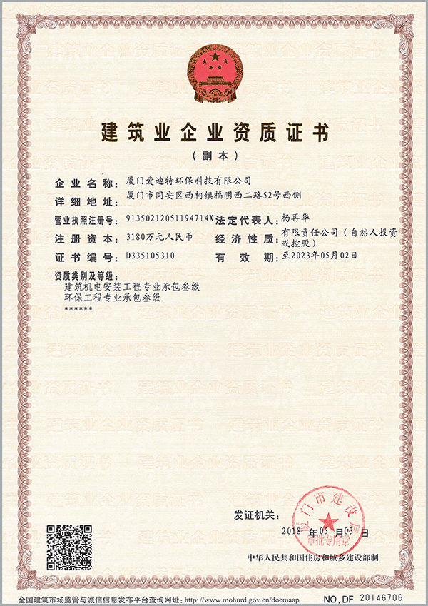 建筑機(jī)電安裝工程專(zhuān)業(yè)承包叁級(jí),環(huán)保工程專(zhuān)業(yè)承包叁級(jí)
